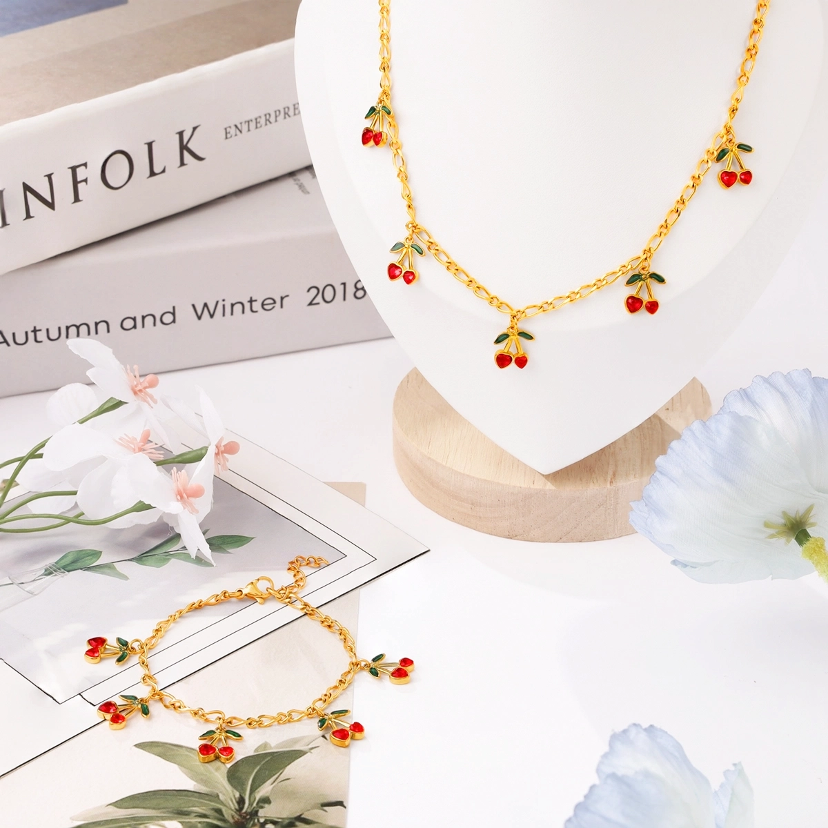 Savor the perfect blend of playfulness and luxury with this hand-strung bracelet, featuring plump cherry charms adorned with sparkling red zircon stones, suspended from a polished oval-link chain.
