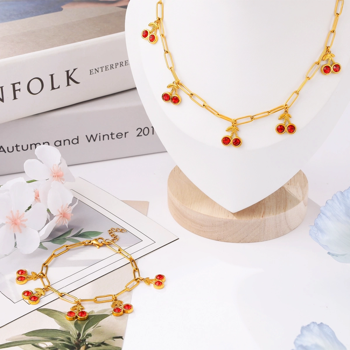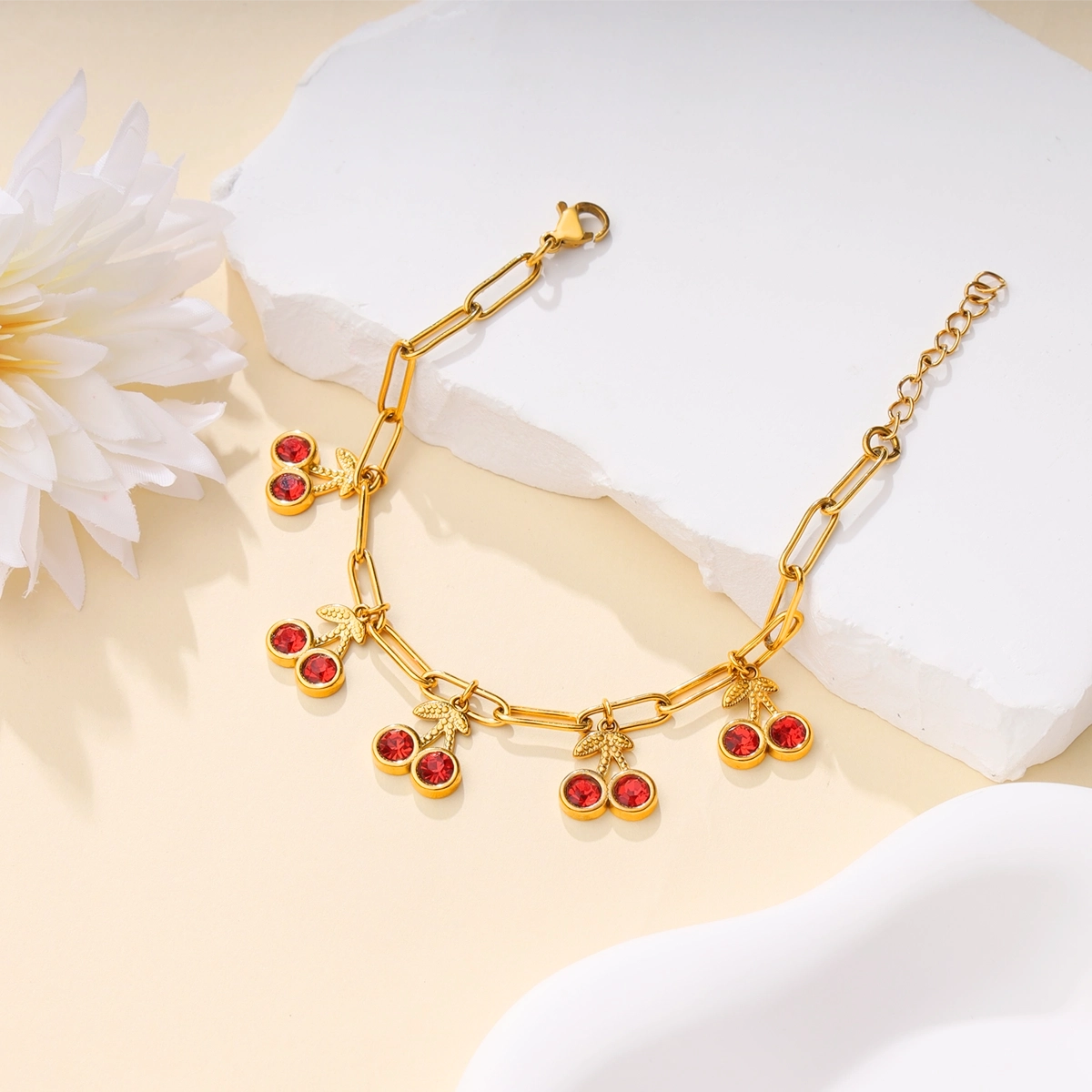 Make a statement with this luxe handcrafted bracelet, featuring plump cherry charms studded with vibrant red zircon stones, elegantly spaced along a polished oval-link chain in gleaming gold-tone stainless steel.